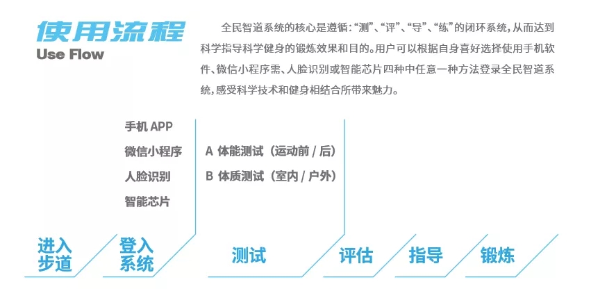 “智能步道”可以为民众提供更全面智能的运动体验,首次进入“智能步道”即可感受到科技栈道的魅力,民众可以根据自身喜好选择使用手机APP、微信小程序、人脸识别或智能芯片四种中任意一种方法登录全民智道系统,系统即可采集用户的体能(呼吸、心率、体温)、体质和运动数据,并经过大数据分析,根据用户体能、体质状态给予科学化、个性化的运动建议及健康饮食建议,还可以通过手机实时享受“电子私教”智能语音健身干预及运动指导的服务。